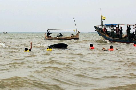 Les sauveteurs tentent de venir en aide au cétacé désorienté, mais l'afflux de touristes venus assister à l'agonie de l'animal gêne leurs efforts.