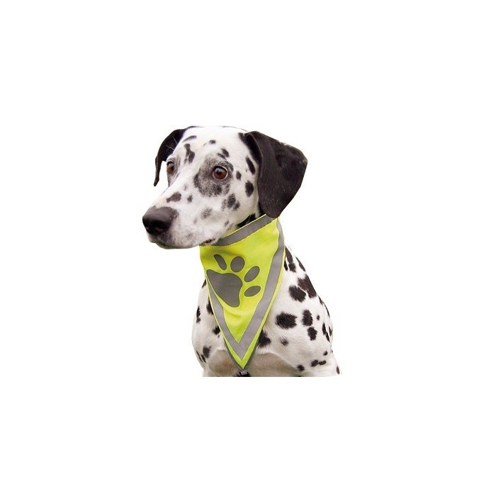 Bandana de sécurité pour chien jaune vif avec de larges bandes et motifs réfléchissants.