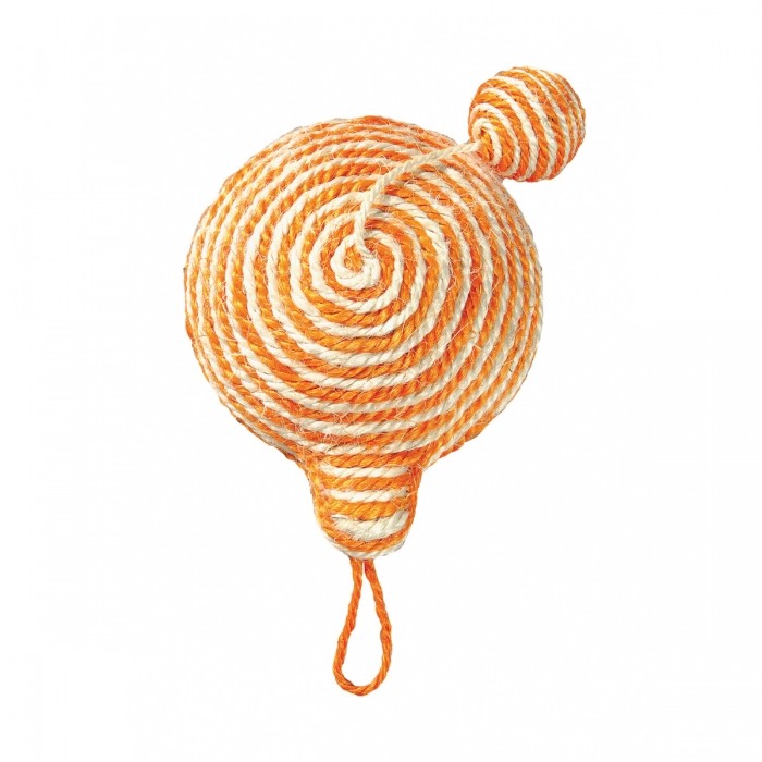Joli griffoir coloré à suspendre ou à poser avec une balle accrochée pour combiner jeu et entretien des griffes.
