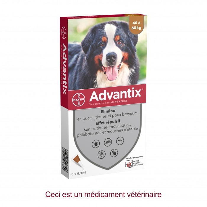 Les pipettes Advantix pour chien de plus de 7 semaines apportent une protection complète contre les tiques, les puces, les moustiques et les phlébotomes. ATTENTION : contre-indication absolue sur les chats.