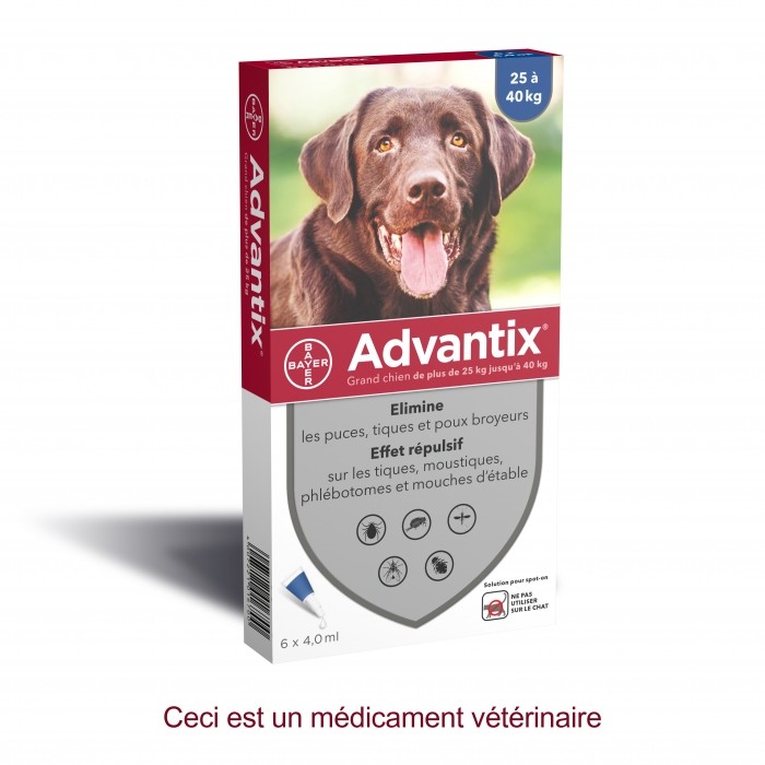 Les pipettes Advantix pour chien de plus de 7 semaines apportent une protection complète contre les tiques, les puces, les moustiques et les phlébotomes. ATTENTION : contre-indication absolue sur les chats.