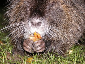 Le ragondin est reconnaissable à ses quatre grandes incisives orange tirant sur le rouge.