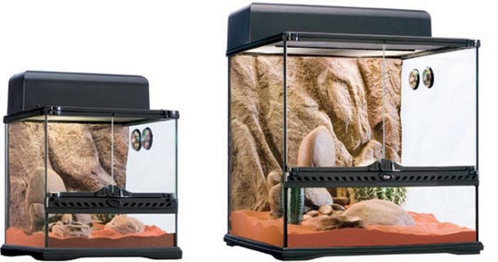 Habitat kit désert : L'habitat équipé Exo Terra reproduisant le climat désertique constitue l'aménagement idéal pour les herpétologistes débutants! L'habitat est équipé de tous les éléments nécessaires pour assurer un bon départ à votre passe-temps; l'équipement inclut le terrarium tout-verre Exo Terra, conçu par des herpétologistes européens. Le terrarium tout-verre Exo Terra est muni de portes ouvrant à l'avant pour faciliter l'accès au moment de l'entretien et du nourrissage. Le couvercle entièrement grillagé fournissant la ventilation sur le dessus permet aux rayons UVB du système d'éclairage fluocompact de pénétrer profondément dans le terrarium. La rampe d'éclairage Compact Top Exo Terra (incluse) a été spécialement conçue pour le terrarium tout-verre Exo Terra.